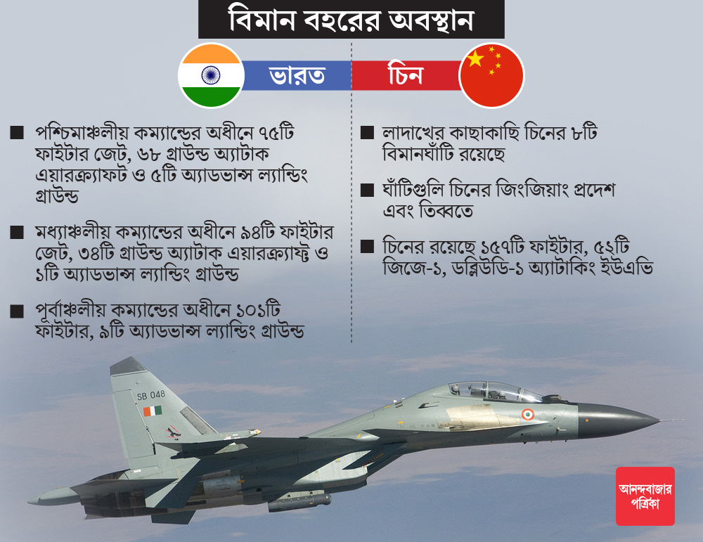 কিন্তু ভারত বিমান বাহিনীর উত্তরাঞ্চলীয়, মধ্য এবং পূর্বাঞ্চলীয় কমান্ডের অন্তত ২৭০টি যুদ্ধবিমান এবং ৬৮টি গ্রাউন্ড অ্যাটাক এয়ারক্রাফ্ট বিমানবাহিনী ব্যবহার করতে পারে চিনের নিয়ন্ত্রণরেখায়।