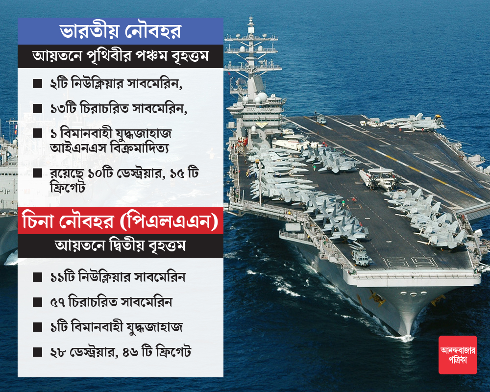 প্রকৃত নিয়ন্ত্রণরেখার লড়াইয়ে সরাসরি যুক্ত না হলেও, চিনের সঙ্গে সম্মুখ সমর হলে উল্লেখযোগ্য ভূমিকা নিতে পারে ভারতীয় নৌবহরও। ১৩৭টি যুদ্ধজাহাজ এবং ২৯১টি বিমান রয়েছে ভারতীয় নৌবহরের অধীনে। রয়েছে পরমাণু জ্বালানিতে চলা সাবমেরিনও।সিএনএএসের দাবি, সম্প্রতি ভারত মহাসাগরে শক্তিবৃদ্ধি করছে চিনা নৌবহর। তবে আন্তর্জাতিক ক্ষেত্রে একাধিক চুক্তির ফলে ভারতীয় নৌবহর ভারত মহাসাগরে যে কোনও যুদ্ধ জাহাজের গতিবিধির উপর নজর রাখার জন্য প্রয়োজনীয় উপগ্রহ চিত্র হাতে পায়। ফলে ভারত মহাসাগরে ভারতীয় নৌবহরেরও ভাল উপস্থিতি রয়েছে। সেই সঙ্গে দক্ষিণ চিন সাগরে ভারতীয় বাহিনীর উপস্থিতি অনেকাংশেই চিনের সমুদ্র বাণিজ্যে ব্যাঘাত তৈরি করতে পারে। কয়েক দিন আগে ফোর্বস পত্রিকায় প্রকাশিত একটি নিবন্ধে উল্লেখ করা হয়েছে, লাদাখে প্রকৃত নিয়ন্ত্রণরেখায় ভারত-চিন উত্তাপ বৃদ্ধির মধ্যেই ভারতীয় নৌবহর নীরবে স্ট্র্যাটেজিক লোকেশনে শক্তিবৃদ্ধি করছে। আয়তনে চিনা নৌবহর ভারতের তুলনায় অনেক বড় হলেও, আন্দামান-নিকোবর দ্বীপপুঞ্জকে কেন্দ্র করে ভারতীয় নৌবহর সঙ্কীর্ণ মলাক্কা প্রণালীতে নজরদারি বাড়িয়েছে। মলাক্কা প্রণালী কৌশলগত দিক থেকে চিনা নৌবহরের সবচেয়ে দুর্বল জায়গা। অন্য দিকে চিনা নৌবহরের বড় অংশই ব্যস্ত দক্ষিণ চিন সাগরে, যেখানে চিনের বন্ধু রাষ্ট্রের থেকে শত্রুর সংখ্যা বেশি। গত ৪৮ ঘণ্টায় সেখানে চিনা নৌবহরের ব্যস্ততা বাড়িয়েছে মার্কিন নৌবহরের উপস্থিতি। যা ভারত-চিন সঙ্ঘাতের এই পর্বে যথেষ্ট ইঙ্গিতবাহী বলে মনে করছেন সমর বিশেষজ্ঞরা।