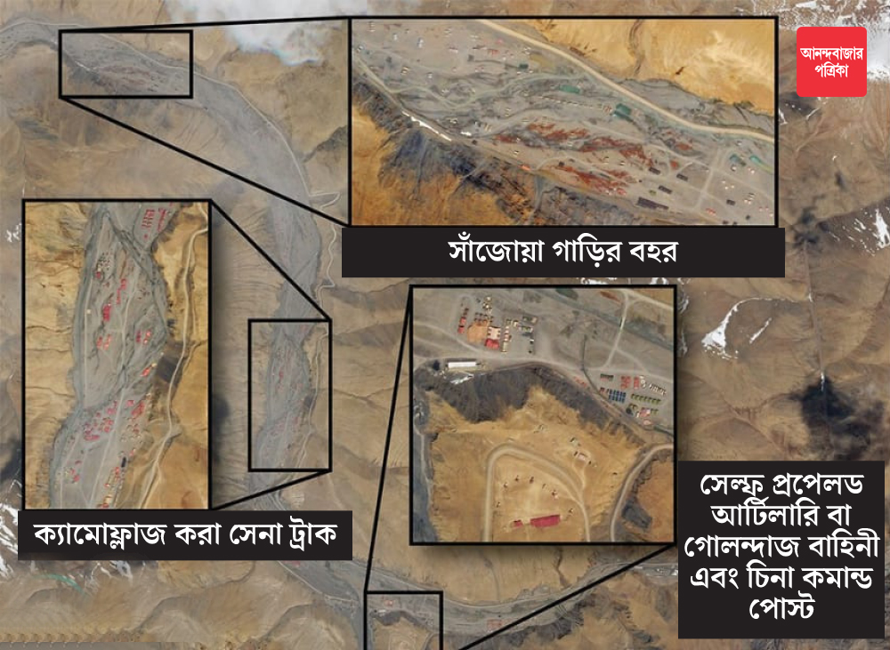 প্রকৃত নিয়ন্ত্রণরেখা লাগোয়া গালওয়ান উপত্যকায় চিনা সেনা সমাবেশের উপগ্রহচিত্র। ছবি সৌজন্য: প্ল্যানেট ল্যাব