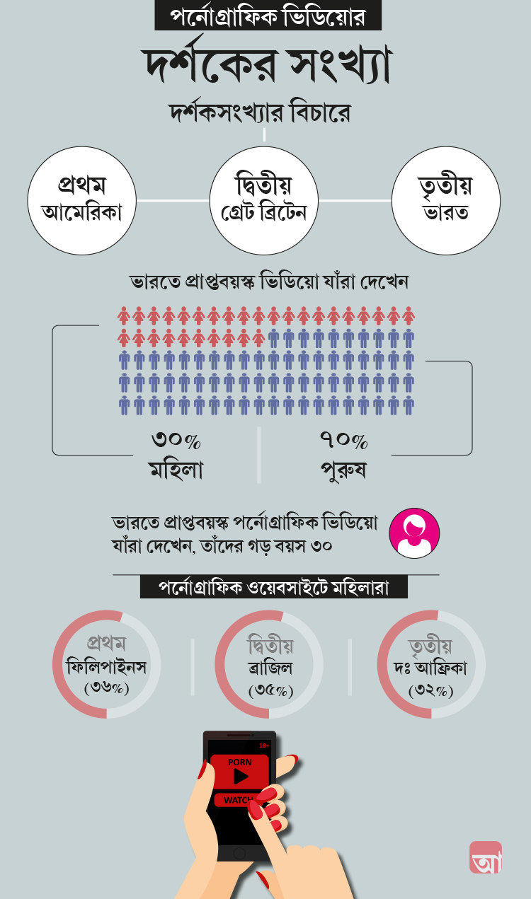 আর প্রাপ্তবয়স্ক বিষয় বা পর্নোগ্রাফিক ভিডিয়ো দেখায় পিছিয়ে নেই ভারতীয় মহিলারাও। রিপোর্টে দেখা যাচ্ছে, ভারতীয় দর্শকদের ৩০ শতাংশই মহিলা। প্রথমে ফিলিপিন্স। এই দেশে দর্শকদের ৩৬ শতাংশই মহিলা। এর পর ব্রাজিল ও দক্ষিণ আফ্রিকা। তার ঠিক পরেই ভারত। অর্থাৎ, মহিলা দর্শকদের সংখ্যায় শতাংশের হিসেবে সারা পৃথিবীতে চার নম্বরে ভারত।