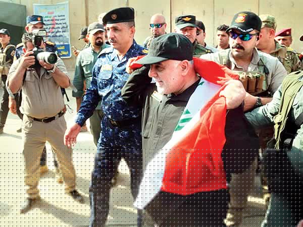 জয়ী: জাতীয় পতাকা গায়ে ইরাকি প্রধানমন্ত্রী হায়দর-আল-আবাদি। রবিবার ‘মুক্ত’ মসুলে। ছবি: এএফপি।