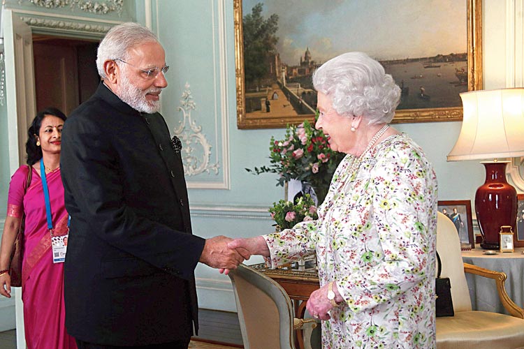 শুভেচ্ছা: রানি দ্বিতীয় এলিজাবেথের সঙ্গে প্রধানমন্ত্রী নরেন্দ্র মোদী। লন্ডনে বাকিংহাম প্যালেসে। ছবি: এএফপি।