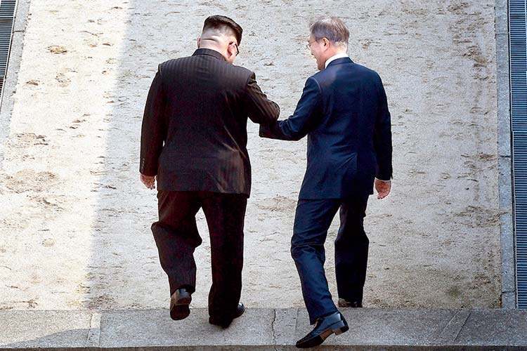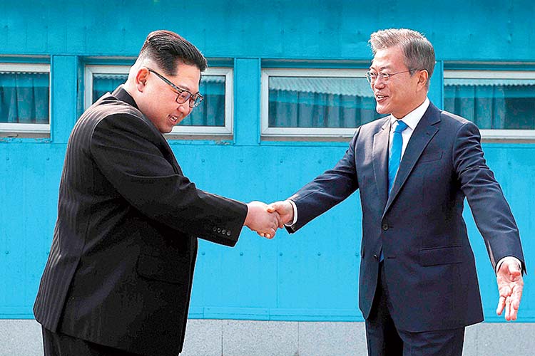 ১৯৫৩ সালের কোরীয় যুদ্ধের পরে দু’দেশের তিক্ততার শুরু। দীর্ঘ ৬৫ বছরের যন্ত্রণার এ বার শেষ। সে যুদ্ধে ইতি টানার কথা ঘোষণা করে শান্তির শপথ নিলেন উত্তর কোরিয়ার শাসক কিম জং উন এবং দক্ষিণ কোরিয়ার প্রেসিডেন্ট মুন জায়ে ইন। সামরিক রেখা পেরিয়ে দক্ষিণ কোরিয়ায় যখন পা দিলেন কিম, তখন তাঁর চারপাশ থেকে সরে গিয়েছেন সরকারি সব স্তরের কর্মী। তিনি একাই এগিয়ে যান এবং বলেন, এটা শান্তির ‘প্রথম ধাপ।’ তার পরে হাসিমুখে দু’নেতার করমর্দন, ক্যামেরার দিকে তাকিয়ে ছবি। সব ছকে বাঁধা। হঠাৎই প্রেসিডেন্ট মুন জায়ে ইনের দিকে হাত বাড়ালেন কিম, যেন বললেন, ‘চলুন ও পারটাও একটু ঘুরে আসি!’ ভিডিয়োবন্দি হল সে দৃশ্য। মুহূর্তের জন্য দক্ষিণ কোরিয়ার প্রেসিডেন্ট ঘুরে এলেন কিমের দেশ। আবার ফিরেও এলেন। সোলের সংবাদমাধ্যমের দাবি, রাষ্ট্রনেতাদের বৈঠক পরিকল্পনামাফিক এগোয়। কিন্তু কিম যে ভাবে ডেকে নিয়ে গেলেন মুনকে, তা মোটেই ‘চিত্রনাট্যে’ লেখা ছিল না।