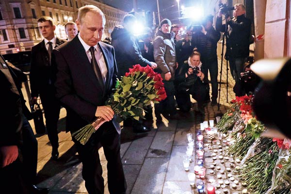স্মরণ: মেট্রো হানায় নিহতদের প্রতি শ্রদ্ধা প্রেসিডেন্ট পুতিনের। সেন্ট পিটার্সবার্গের টেকনোলজিকাল ইনস্টিটিউট সাবওয়ে স্টেশনের সামনে। পিটিআই