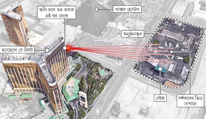 লাস ভেগাস শেরিফ জোসেফ লোম্বার্ডো জানিয়েছেন, গুলিবর্ষণ শুরু হয় স্থানীয় সময় রাত দশটা আট মিনিটে। তার পর ক্রমান্বয়ে চলতেই থাকে তা। অনুষ্ঠানস্থলের অদূরেই ম্যান্ডেলে বে হোটেল। পুলিশ যত ক্ষণে বুঝতে পারে গুলি ধেয়ে আসছে হোটেলের ৩৩ তলা থেকে, তত ক্ষণে পেরিয়ে গিয়েছে দু’ঘণ্টা সময়। চোখের সামনে প্রিয়জনকে আচমকা মাটিতে লুটিয়ে পড়তে দেখে দিশাহারা হয়ে পড়েন বহু মানুষ। প্রাণ বাঁচাতে কোথায় ছুটবেন, বুঝতে পারেননি। কেউ কেউ গুলি এড়াতে সটান শুয়ে পড়েন। তাতেও শেষ রক্ষা হয়নি।