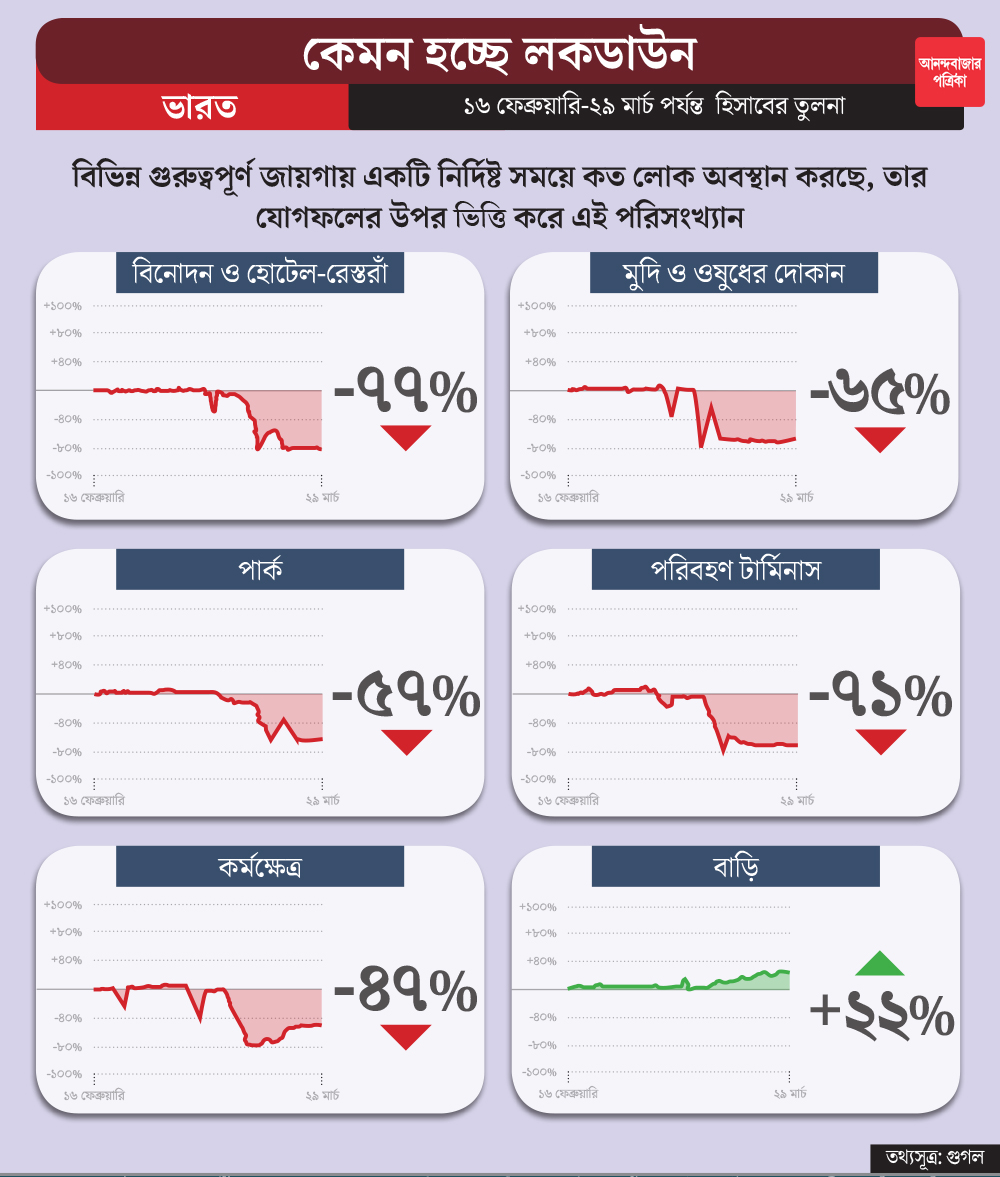 গুগলের দেওয়া তথ্য থেকে স্পষ্ট, এ দেশে লকডাউনে নানা জায়গায় মানুষের উপস্থিতি ব্রিটেন ও আমেরিকার তুলনায় অনেকটা বেশি হারে কমেছে। সবচেয়ে বেশি কমেছে অবশ্য করোনাভাইরাসের অন্যতম ক্ষতিগ্রস্ত দুই দেশ— ইতালি ও স্পেনে। গুগল এই রিপোর্টে গণপরিসরকে ছ’টি ক্ষেত্রে ভাগ করেছে। সেগুলি হল, বিনোদনের জায়গা, নিত্যপ্রয়োজনীয় জিনিসের দোকান, পার্ক, গণপরিবহণের কেন্দ্র, কর্মক্ষেত্র ও বাড়ি।