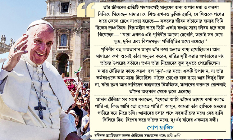 পোপ ফ্রান্সিসের পক্ষ থেকে আজ উপস্থিত জনতার হাতে তুলে দেওয়া হয় বাইবেলের উদ্ধৃতি সম্বলিত একটি টেক্সট, যা আজ প্রার্থনামন্ত্রও বটে। তাতে অন্য সব ভাষার পাশাপাশি রয়েছে বাংলাও। মমতা আজ বলেন, ‘‘মাদারের সন্ত হওয়ার ঘটনায় আমি রোমাঞ্চিত। খুশি তো বটেই। মা বাংলার মানুষ। তাই বাংলার গর্ব এখানে প্রতিষ্ঠিত হল।’’ প্রতিনিধিদলের বুকে একটি ব্যাজ তিনি দিয়েছেন যেখানে লেখা— ‘উইথ হোমেজ ফ্রম দ্য সিটি অব মাদার, ক্যালকাটা’। ব্যাজের উপরে লেখা, ‘টিম বাংলা’।