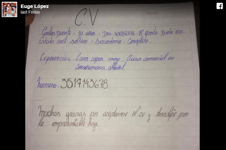 তাঁর ফেসবুক পোস্টে লোপেজ লিখেছিলেন, তিনি যেখানে কাজ করেন সেই ক্যাফেতে কোনও জায়গা খালি নেই চাকরির জন্য। তবে তাঁকে এক কপি বায়োডেটা পাঠিয়ে রাখতে বলেন কার্লোসকে। তাঁর কোনও চেনা-জানা লোককে কার্লোসের চাকরির জন্য বলবেন বলে আশ্বাস দেন লোপেজ। তখন কার্লোস তাঁকে জানায়, বায়োডেটা পাঠাতে গেলে তো কম্পোজ করাতে হবে, তার প্রিন্ট আউট নিতে হবে। কিন্তু তার জন্য অর্থ নেই কার্লোসের হাতে। তা শুনে লোপেজ তাঁকে বায়োডেটা হাতে লিখতে বলেন। তার পর তার ছবি তুলে পাঠাতে বলেন তাঁকে।