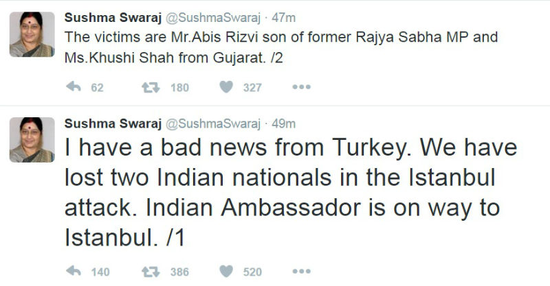 এই ঘটনায় ২ জন ভারতীয় মারা গিয়েছেন বলে টুইটারে জানিয়েছেন ভারতের বিদেশমন্ত্রী সুষমা স্বরাজ। তিনি বলেন, ‘‘তুরস্ক থেকে ভীষণ খারাপ খবর এসে পৌঁছেছে। ইস্তানবুল হামলায় দু’জন ভারতীয় মারা গিয়েছেন।’’ ইতিমধ্যেই ঘটনাস্থলের উদ্দেশে রওনা দিয়েছেন ইস্তানবুলে নিযুক্ত ভারতীয় রাষ্ট্রদূত। মৃত দুই ভারতীয়ের নামও জানিয়েছেন বিদেশমন্ত্রী। তাঁরা হলেন, রাজ্যসভার প্রাক্তন সাংসদের পুত্র আবিজ রিজভি এবং আরেকজন হলেন গুজরাতের বাসিন্দা খুশি শাহ।