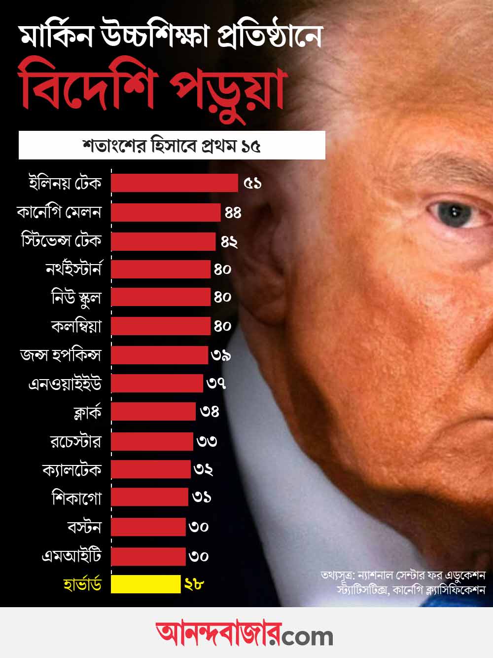 ট্রাম্প সরকারের পরিসংখ্যান বলছে, ২০২৪-২৫ শিক্ষাবর্ষে বিদেশি পড়ুয়াদের মোট আর্থিক অবদান ছিল ৪৩০০ কোটি ডলার (৩ লক্ষ ৬৬ হাজার কোটি টাকারও বেশি)! ‘ক্যাম্পাসে ইহুদি বিদ্বেষ এবং চিনা কমিউনিস্ট মতাদর্শের বাড়বাড়ন্তে’র অজুহাতে ট্রাম্প সরকারের ‘হোমল্যান্ড সিকিউরিটি সার্ভিস’ হার্ভার্ডের মতো অন্যান্য উচ্চশিক্ষা প্রতিষ্ঠানগুলির বিদেশি পড়ুয়াদের নিশানা করলে সামগ্রিক ভাবে মার্কিন অর্থনীতিতে তার প্রত্যক্ষ নেতিবাচক প্রভাব পড়বে। ক্ষতিগ্রস্তহবে বিশ্ববিদ্যালয়গুলি।