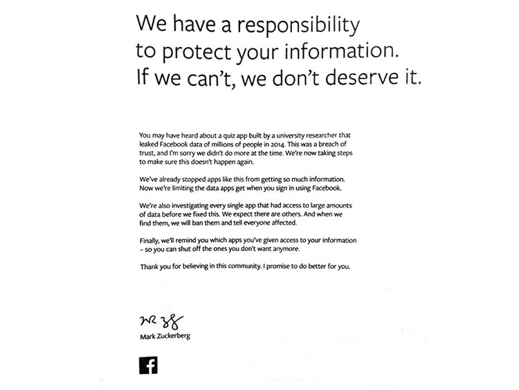 তথ্য-চুরি নিয়ে ক্ষমা আগেই চেয়েছিলেন। রবিবার ব্রিটিশ সংবাদপত্রগুলোতে পাতাজোড়া বিজ্ঞাপন দিয়ে ক্ষমা চাইলেন ফেসবুক-মালিক মার্ক জুকেরবার্গ।