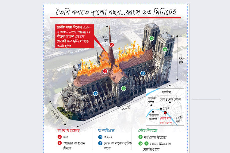বানাতে লেগেছিল দু’শো বছর। ৬৩ মিনিটের আগুনে প্রথমে ভেঙে পড়ল ক্যাথিড্রালের প্রধান ধাতব মিনারের চূড়া। ঘণ্টা চারেকের মধ্যে পুড়ে ছাই গোটা ছাদ। সাড়ে আটশো বছরেরও বেশি পুরনো সৌধটির এই বিপর্যয় পাল্টে দিল প্যারিসের আকাশ-ছবি।