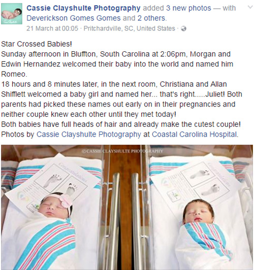 সম্প্রতি ফটোগ্রাফার ক্যাসি ক্লেশুলতে একটি প্রোজেক্টে আমেরিকার সাউথ ক্যারোলিনার এক হাসপাতালে গিয়েছিলেন। তাঁর কাজ ছিল সদ্যোজাতদের ছবি তোলা। ছবি তুলতে তুলতে পাশাপাশি বেডে শুইয়ে রাখা দুই শিশুরও ছবি তোলেন তিনি। পরে তাঁদের জন্ম তথ্য সংগ্রহ করতে গিয়ে চমকে ওঠেন। জানতে পারেন তারা এক জন হল রোমিও আর অন্য জন জুলিয়েট!
