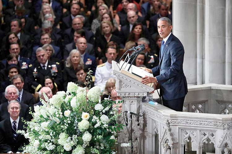 স্মরণ: মার্কিন সেনেটর জন ম্যাকেনের শেষকৃত্য অনুষ্ঠানে বক্তৃতা প্রাক্তন প্রেসিডেন্ট বারাক ওবামার। ছবি: রয়টার্স।
