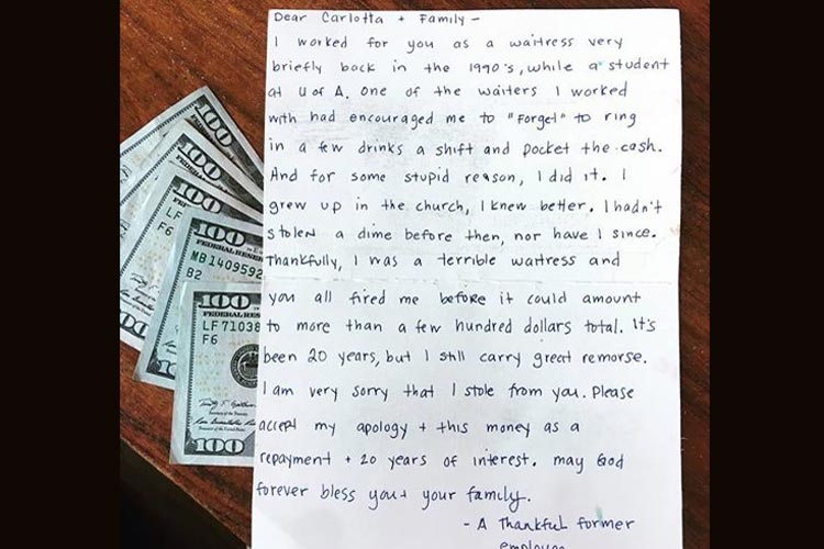 একটি চিঠি রয়েছে খামে আর রয়েছে নগদ হাজার ডলার। চিঠিটি পাঠিয়েছেন রেস্তরাঁর এক প্রাক্তন কর্মী। তবে নেই প্রেরকের নামের উল্লেখ। রেস্তরাঁর ওই কর্মী লিখেছেন, নব্বইয়ের দশকে ওই রেস্তরাঁয় কাজ করতেন। ছাত্রী ছিলেন অ্যারিজোনা বিশ্ববিদ্যালয়ে।