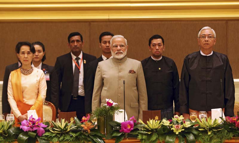 মায়ানমারের স্টেট কাউন্সেলর সু চি এবং প্রেসিডেন্টের মাঝে ভারতের প্রধানমন্ত্রী নরেন্দ্র মোদী। ছবি: এপি।