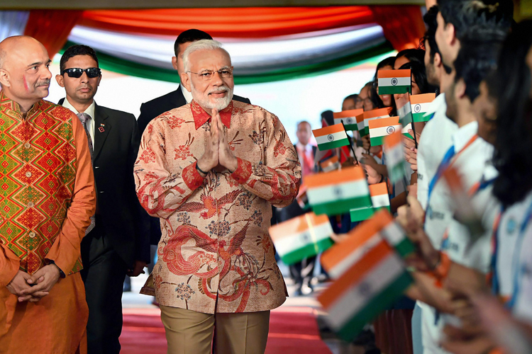 জাকার্তায় প্রবাসী ভারতীয়দের অনুষ্ঠানে প্রধানমন্ত্রী নরেন্দ্র মোদী। ছবি: পিটিআই।