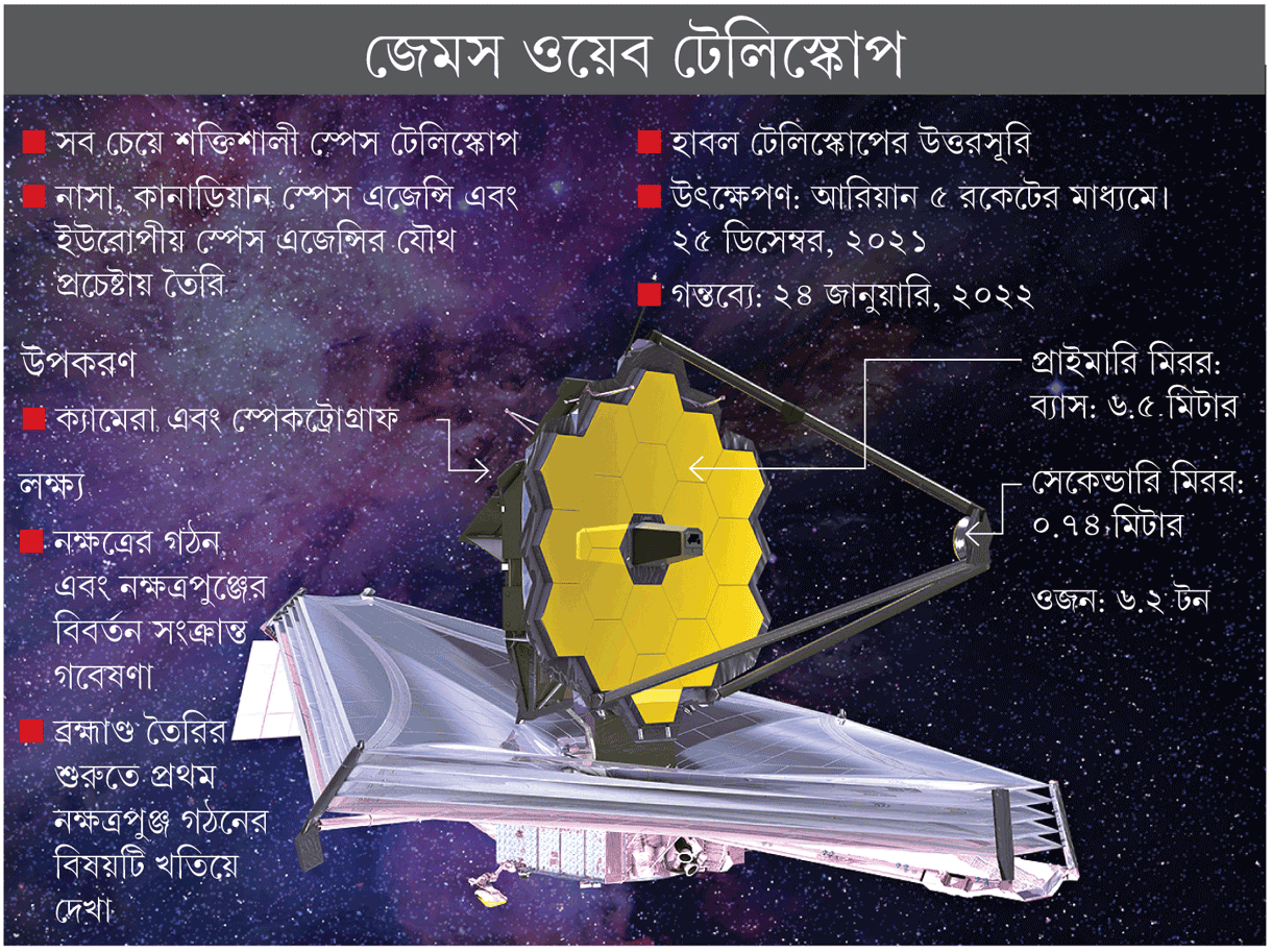 ১৫ লক্ষ কিলোমিটার দূরেও পৃথিবী এবং সূর্যের তাপ থেকে বাঁচাতে ৫টি পর্দা লাগানো হয়েছে জেমস ওয়েব টেলিস্কোপে। এক-একটি পর্দার মাপ টেনিস কোর্টের সমান। এই টেলিস্কোপে রয়েছে ১৮টি ষড়ভুজ আয়না। যার সম্মিলিত ব্যাস ৬.৫ মিটার। ঠিক যেমন ভাবে রাতের আঁধারে কোনও কোনও ফুল পাপড়ি মেলে সে ভাবেই ১৮টি আয়না মহাকাশে উন্মীলিত হয়েছে।তা দিয়েই চলেছে ব্রহ্মাণ্ডের অতীতের খোঁজ।