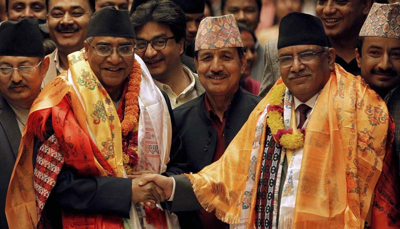 নবনির্বাচিত প্রধানমন্ত্রী দেউবাকে অভিনন্দন নতুন সরকারের দ্বিতীয় বৃহত্তম শরিক দলের নেতা তথা দু’সপ্তাহ আগে প্রধানমন্ত্রী পদ থেকে ইস্তফা দেওয়া প্রচণ্ডের। ছবি: এপি।