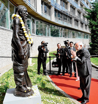 প্যারিসে ইউনেস্কোর সদর দফতরে শ্রী অরবিন্দের মূর্তির সামনে প্রধামন্ত্রী নরেন্দ্র মোদী। শুক্রবার। ছবি: পিটিআই।
