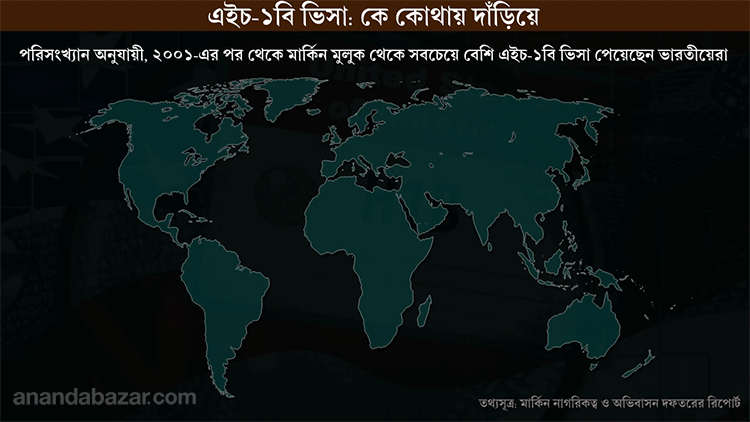 ইউএসসিআইএস-এর পরিসংখ্যান অনুযায়ী, গোটা বিশ্ব থেকে এইচ-১বি ভিসার জন্য আবেদনের বেশির ভাগটাই আসে ভারত থেকে। ২০০১ সাল থেকে এখনও পর্যন্ত এইচ-১বি ভিসা নিয়ে আমেরিকায় গিয়েছেন ৮৯ লক্ষ ২৮ হাজার ১৪ জন ভারতীয়। এই মুহূর্তে আমেরিকায় রয়েছেন প্রায় সাড়ে সাত লক্ষ ভারতীয় পেশাদার।