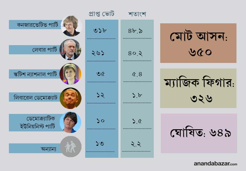 এ দিন মোট ৬৫০টি আসনের মধ্যে ৬৪৯টির ফল ঘোষণা হওয়ার পর দেখা যায় ৩১৮টি আসন পেয়েছে কনজারভেটিভ পার্টি। অন্য দিকে, জেরেমি বার্নার্ড করবিনের লেবার পার্টি পেয়েছে ২৬১টি। স্কটিশ ন্যাশনাল পার্টি পেয়েছে ৩৫টি এবং টিম ফ্যারনের লিবারেল ডেমোক্র্যাট পেয়েছে ১২টি। ডেমোক্র্যাটিক ইউনিয়ানিস্ট পার্টি পেয়েছে ১০টি আসন। গত বারের তুলনায় এ বারে লেবার পার্টির আসন বাড়লেও ম্যাজিক ফিগার থেকে অনেকটাই দূরে তারা। পার্লামেন্টের হাউস অব কমন্সে সংখ্যাগরিষ্ঠতা প্রমাণ করতে কনজারভেটিভ পার্টির দরকার আরও ৮টি আসন। বিশেষজ্ঞরা বলছেন, থেরেসা মে সে ক্ষেত্রে যদি লিবারেল ডেমোক্র্যাট-এর সমর্থন পান, তা হলেই সরকার গঠন সম্ভব হবে। গোটা নির্বাচনের নাটকীয় মোড় এখানেই। দোরগোড়ায় এসেও একক সংখ্যগরিষ্ঠতা না পাওয়ায় ব্রিটেনের সঙ্গে মে-রও ভাগ্য ঝুলে রইল। এ বারের নির্বাচনে কোনও দল সংখ্যাগরিষ্ঠতা পাবে কিনা নির্বাচনের পর পরই সে বিষয়ে সংশয় প্রকাশ করেছিলেন রাজনৈতিক বিশেষজ্ঞরা। তাঁদের সে আশঙ্কাই সত্যি হল।