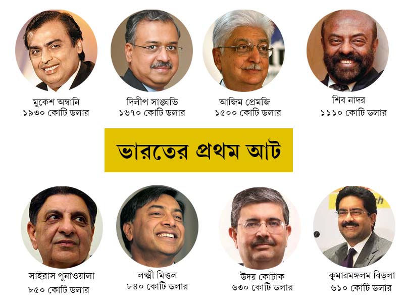 ভারতে ৮৪ জন বিলিয়নেয়ারের কথা অক্সফ্যামের রিপোর্টে উল্লেখ করা হয়েছে। এই ৮৪ জনই ২৪ হাজার ৮০০ কোটি ডলারের মালিক। প্রথম স্থানে মুকেশ অম্বানি। তাঁর সম্পদের পরিমাণ ১ হাজার ৯৩০ কোটি ডলার। দ্বিতীয় স্থানে সানফার্মার দিলীপ সাঙ্ঘভি, তৃতীয় উইপ্রোর আজিম প্রেমজি। তাঁদের সম্পদের পরিমাণ যথাক্রমে ১ হাজার ৬৭০ কোটি ডলার এবং ১ হাজার ৫০০ কোটি ডলার। আর গোটা বিশ্বে এই মুহূর্তে প্রথম স্থানে সেই বিল বিল গেটসই। দ্বিতীয় স্থানে অ্যামানসিও ওর্তেগা এবং তৃতীয় ওয়ারেন বাফেট। এই তিন জনের হাতে রয়েছে যথাক্রমে ৭ হাজার ৫০০ কোটি ডলার, ৬ হাজার ৭০০ কোটি ডলার এবং ৬ হাজার ৮০ কোটি ডলার।