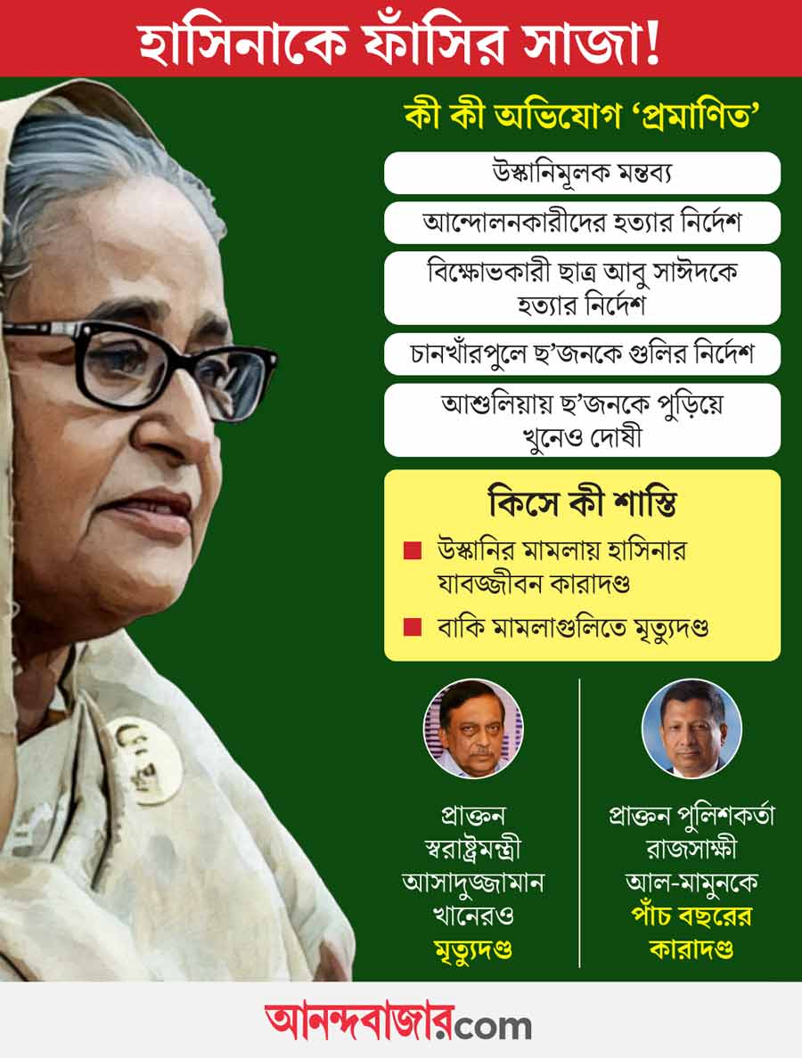 রায় ঘোষণার পর লিখিত বিবৃতি দিয়ে হাসিনা দাবি করেছেন, তাঁর বিরুদ্ধে আনা মানবাধিকার লঙ্ঘনের অভিযোগগুলির সপক্ষে কোনও প্রমাণ নেই। বরং তাঁর আমলে মানবাধিকার এবং উন্নয়নমূলক অনেক কাজ হয়েছে। সে জন্য তিনি গর্বিতও। আওয়ামী লীগ নেত্রীর দাবি, রাজনৈতিক উদ্দেশ্যপ্রণোদিত ভাবে এই রায় দেওয়া হয়েছে, তা-ও আবার একটি অনির্বাচিত সরকারের অধীনস্থ অবৈধ ট্রাইবুনাল সেই রায় দিয়েছে। মৃত্যুদণ্ডের রায়ও প্রত্যাখ্যান করেছেন হাসিনা। তাঁর কথায়, ‘‘এই রায় অন্তর্বর্তিকালীন সরকারে থাকা চরমপন্থী ব্যক্তিদের নির্লজ্জতা ও খুনি মনোভাবের প্রতিফলন মাত্র। বাংলাদেশের শেষ নির্বাচিত প্রধানমন্ত্রীকে অপসারণ করতে এবং আওয়ামী লীগকে রাজনৈতিক ভাবে ভেঙে দিতে এই কাজ করা হয়েছে।’’