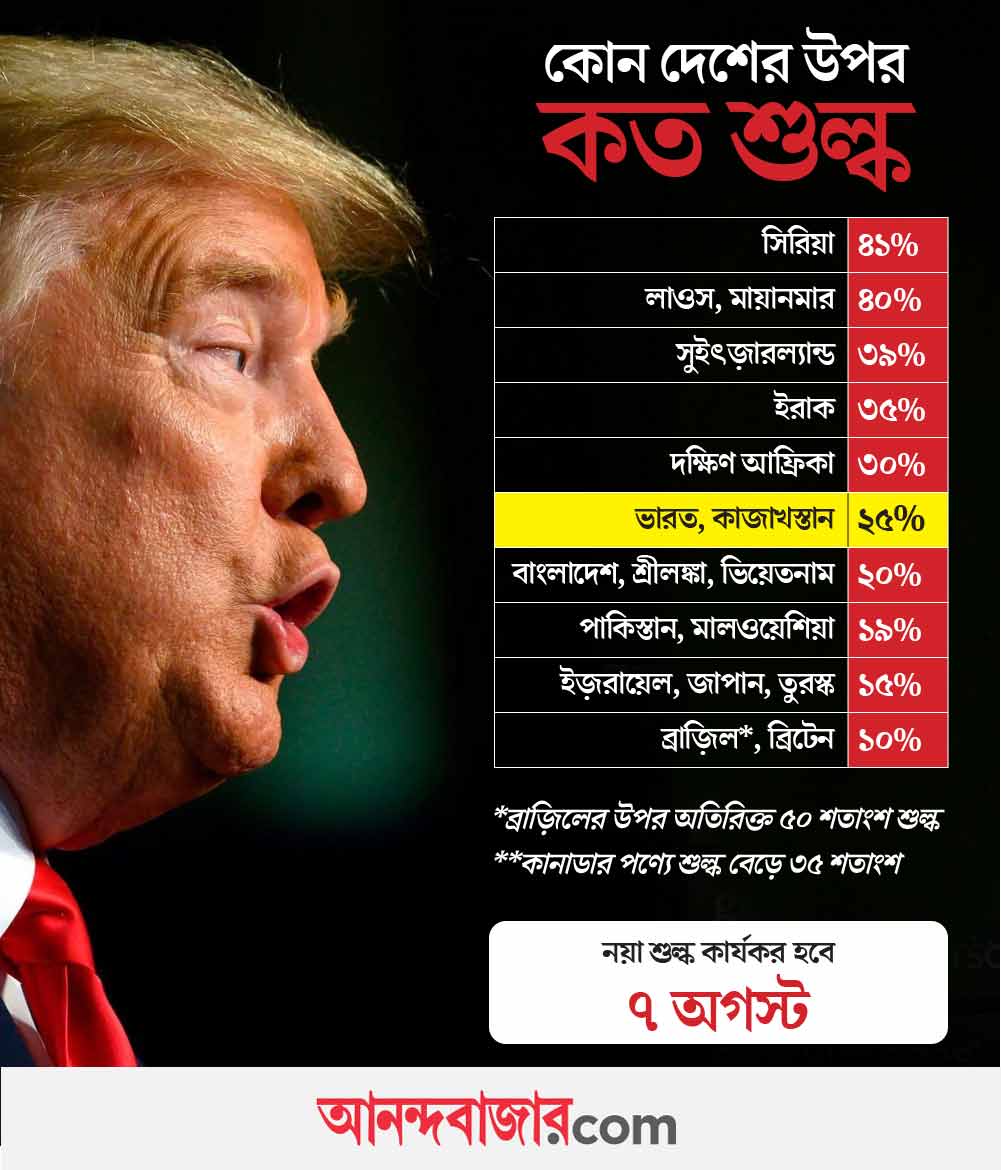 বুধবারই ট্রাম্প জানিয়েছিলেন, ‘বন্ধু’ ভারতের পণ্যে ২৫ শতাংশ শুল্ক চাপানো হবে। মালয়েশিয়া, ইন্দোনেশিয়া, কম্বোডিয়া, তাইল্যান্ডের পণ্যে ১৯ শতাংশ পারস্পরিক শুল্ক আরোপ করছে আমেরিকা। বাংলাদেশ, শ্রীলঙ্কা, তাইওয়ান, ভিয়েতনামের উপর প্রযুক্ত হচ্ছে ২০ শতাংশ শুল্ক। সেই হিসাবে ভারতীয় উপমহাদেশে তো বটেই গোটা দক্ষিণ এশিয়ায় সবচেয়ে কম শুল্ক দিতে হচ্ছে ইসলামাবাদকে। অবশ্য চিনের সঙ্গে বাণিজ্য বৈঠকের পর সে দেশের পণ্যে আমেরিকা কত শতাংশ শুল্ক চাপাবে, তা এখনও স্পষ্ট নয়।