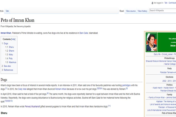 আসলে এরা পাকিস্তানের হবু প্রধানমন্ত্রীর পোষ্য। তাদের নামেই উইকিপিডিয়া পেজ। হ্যাঁ ঠিকই শুনছেন, ইমরান খানের প্রিয় পোষ্যদের নামে খোলা হয়েছে উইকিপিডিয়া পেজ। উইকিপিডিয়ার অনলাইন হেল্প ডেস্কের তরফে এই খবরের সত্যতা স্বীকার করা হয়েছে বলে জানিয়েছে ‘দ্য এক্সপ্রেস ট্রিবিউন’।