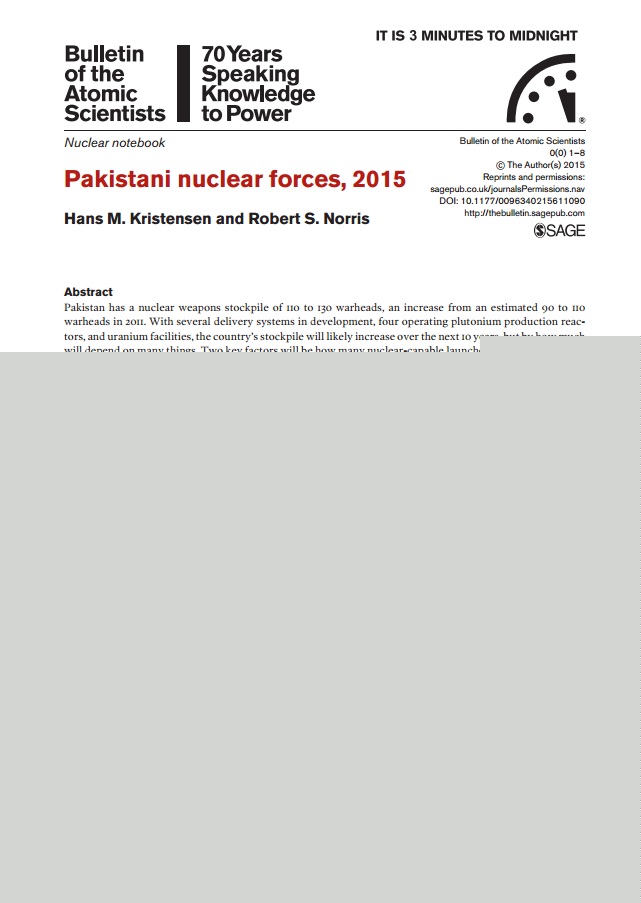 আগামী ১০ বছরের মধ্যে পৃথিবীর টপ ফাইভ পরমাণু শক্তিধরের তালিকায় ঢুকে পড়তে চলেছে পাকিস্তান। চাঞ্চল্যকর এই তথ্য তুলে ধরেছে একটি মার্কিন রিপোর্ট। ‘পাকিস্তানি নিউক্লিয়ার ফোর্সেস ২০১৫’ নামের এই সাম্প্রতিক রিপোর্ট প্রকাশিত হয়েছে আমেরিকার ‘বুলেটিন অফ দ্য অ্যাটমিক সায়েন্টিস্টস’ পত্রিকায়। রিপোর্ট বলছে, এই মুহূর্তে পাকিস্তানের হাতে ১১০ থেকে ১৩০টি পরমাণু যুদ্ধাস্ত্র রয়েছে। ২০১১ সালে যে সংখ্যাটা ছিল ৯০ থেকে ১১০-এর মধ্যে। ২০২৫ সালে পাকিস্তানের হাতে মজুত পরমাণু অস্ত্রের সংখ্যা ২২০ থেকে ২৫০-এর মধ্যে পৌঁছে যাবে বলে হিসেব এই রিপোর্টের।