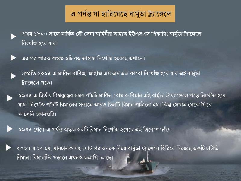 এ যুগের অন্যতম বড় রহস্য বার্মুডা ট্র্যাঙ্গল। অতলান্তিক মহাসাগরের প্রায় ৪ লক্ষ ৪০ হাজার মাইল এলাকা জুড়ে ছড়িয়ে রয়েছে বার্মুডা ট্র্যাঙ্গল। অসংখ্য মানুষ, বিমান, জাহাজ এই ত্রিকোণ রহস্যের মধ্যে পড়ে চিরতরে হারিয়ে গিয়েছে। ১৪৯২ সালে স্পেনীয় নাবিক এবং ভূপর্যটক ক্রিস্টোফার কলোম্বাস প্রথম এই বার্মুডা ট্রায়্যাঙ্গল সম্পর্কে লেখেন। তাঁর জাহাজের কম্পাসও বার্মুডা ট্রায়্যাঙ্গেলে অকেজো হয়ে যায়। সে যাত্রায় কোনও ক্রমে উদ্ধার পান তিনি। কেন বার্মুডা ট্রায়্যাঙ্গেলে এলেই বিপর্যয়ের মুখে পড়তে হয় বিমান বা জাহাজকে? কী বলছেন বিজ্ঞানীরা! বিগত একশো বছর ধরে একাধিক সম্ভাবনা, অনুমান সামনে এলেও কোনও নির্দিষ্ট ব্যাখ্যা দিতে পারেননি বিজ্ঞানীরা। তবে ২০১৬-য় বিখ্যাত আবহবিদ র্যান্ডি কারভ্যানি-সহ বেশ কিছু বিজ্ঞানী ব্যাখ্যা দেন এই রহস্যের। তাঁদের দাবি, বারমুডা ট্রায়্যাঙ্গেলের রহস্যের পিছনে রয়েছে এক রকম ষড়ভুজাকৃতি মেঘ (হেক্সাগোনাল ক্লাউড)। উত্তর আটলান্টিক মহাসাগরের বারমুডা দ্বীপে ২০ থেকে ৫৫ মাইল জুড়ে ষড়ভুজাকৃতি মেঘ তৈরি করে উচ্চ ক্ষমতাসম্পন্ন বায়ু। যার গতিবেগ ঘণ্টায় ১৭০ মাইল। এই উচ্চ ক্ষমতাসম্পন্ন বায়ুকে বলা হয় ‘এয়ার বম্ব’। এই বায়ু প্রায় ৪৫ ফুট উচ্চতার ঝড় তৈরি করতে পারে। যার ফলে বারমুডা ট্রায়্যাঙ্গেল দিয়ে যাওয়া জাহাজ বা প্লেন উধাও হয়ে যায়।