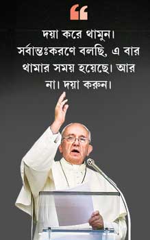 কিন্তু আজকের দিনটা আলাদা। ঐতিহাসিক। একশো বছর আগে, এর পরের দিন, অর্থাৎ ২৮ জুলাই, শুরু হয়েছিল প্রথম বিশ্বযুদ্ধ। বিশ্ব ইতিহাসের এক গুরুত্বপূর্ণ সন্ধিক্ষণ সেটি। সেন্ট পিটার্স স্কোয়ারে সমবেত সকলে জানতেন, আজ সেই বাঁক বদলের গল্পই বলবেন পোপ। কিন্তু চিত্রনাট্য বদলে ফেললেন ফ্রান্সিস নিজেই। লিখিত বয়ানের বাইরে বেরিয়ে এলেন। ইতিহাস ফেলে পৌঁছে গেলেন আজকের রক্তস্নাত পৃথিবীতে। গাজা-ইরাক-ইউক্রেনে। গলার মধ্যে জমে থাকা কান্না বেরিয়ে এল আবেদন হয়ে। বিশ্বশান্তির বার্তা দিয়ে পোপের আর্তি, “দয়া করে থামুন। সর্বান্তঃকরণে বলছি, এ বার থামার সময় হয়েছে। আর না। দয়া করুন।”