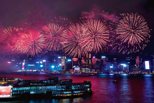 রোশনাই: চিনা শাসনের কুড়ি বছর। আতসবাজির প্রদর্শনী হংকংয়ের ভিক্টোরিয়া হারবারে। ছবি: এএফপি