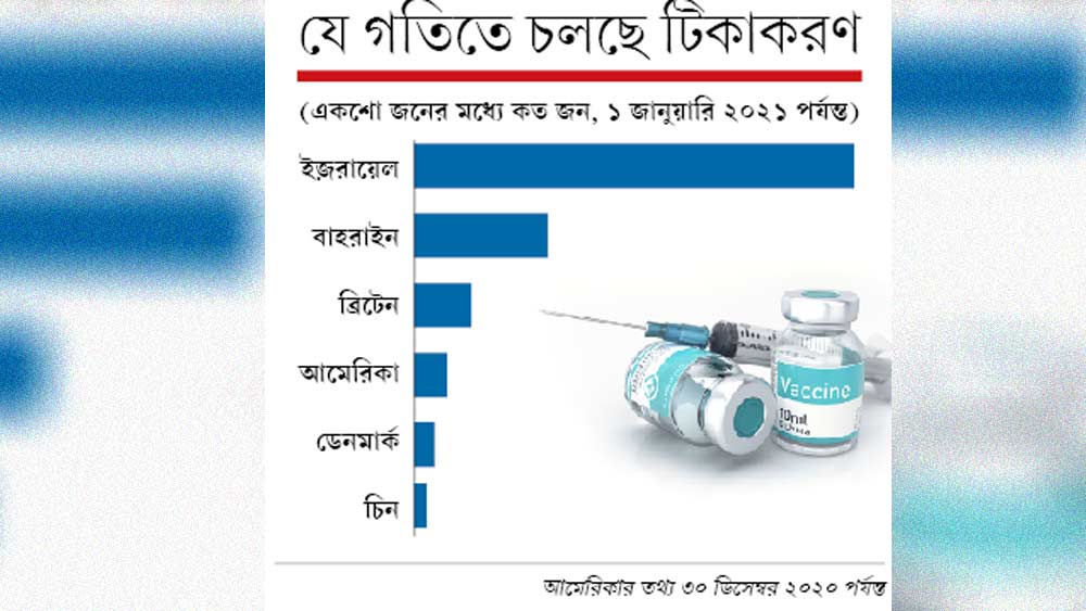 অক্সফোর্ড বিশ্ববিদ্যালয় স্বীকৃত একটি আন্তর্জাতিক পর্যবেক্ষক সংস্থার পরিসংখ্যান জানাচ্ছে, টিকাকরণে দৌড়ে প্রথম ইজ়রায়েল। দ্বিতীয় স্থানে বাহরাইন (৩.৪৯ শতাংশ)। তৃতীয় স্থানে রয়েছে ব্রিটেন (১.৪৭ শতাংশ)। তারও পরে আমেরিকা। ডিসেম্বরের মধ্যে ২ কোটির লক্ষ্যমাত্রা নিয়েছিল তারা। উচ্চাশার ধারেকাছেও নেই আমেরিকা। প্রশাসনের তরফেই জানানো হয়েছে, পরিকাঠামো ব্যবস্থার গাফিলতির জন্য এই অবস্থা। যেমন, কেয়ার হোমগুলোতে ২২ লক্ষ ডোজ় পাঠানো হয়েছিল। টিকা দেওয়া গিয়েছে মাত্র ১ লক্ষ ৭০ হাজার লোককে।