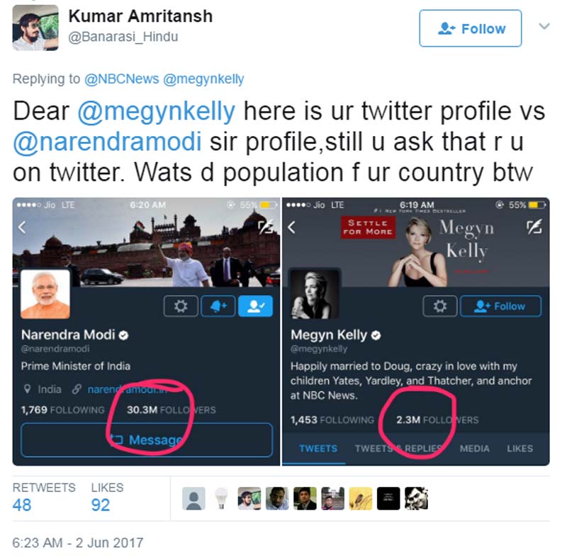 কেউ টুইট করে কেলিকে মনে করিয়ে দিতে চেয়েছেন যে, টুইটারে ‘মোস্ট ফলোড’ রাষ্ট্রনায়কদের মধ্যে তৃতীয় স্থানে রয়েছেন ভারতের প্রধানমন্ত্রী নরেন্দ্র মোদী। অনেকে বলছেন, পুতিন আর মোদীর সঙ্গে দেখা করার আগে যথেষ্ট ‘হোম ওয়ার্ক’ করে যাননি কেলি। তাই এই বিড়ম্বনা। কেউ আবার টুইটারে ‘ফলোয়ার’-এর সংখ্যায় তুলনা টেনে লিখেছেন, ‘@মেগানকেলি, এই দেখুন নরেন্দ্র মোদীর টুইটার প্রোফাইল। যার ৩ কোটি ফলোয়ার। আপনার দেশের জনসংখ্যা কত? এর পরও কি আপনি প্রশ্ন করবেন নরেন্দ্র মোদী টুইটারে আছেন কী না?’