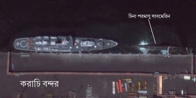 এক উপগ্রহ চিত্র বিশেষজ্ঞ সম্প্রতি করাচি বন্দরে চিনা পরমাণু সাবমেরিনের উপস্থিতির এই ছবিটি টুইটারে প্রকাশ করেছেন। গুগল আর্থ থেকে এই ছবিটি পাওয়া গিয়েছে। যে সাবমেরিনটিকে করাচিতে দেখা গিয়েছে, সেটি চিনা নৌসেনার হাতে আসা টাইপ ০৯১ ‘হান’ ক্লাস নিউক্লিয়ার অ্যাটাক সাবমেরিন— দাবি উপগ্রহ চিত্র বিশেষজ্ঞের। তবে ছবিটি সামনে আসার পর ভারতীয় নৌসেনার কর্তারা সংবাদমাধ্যমকে জানিয়েছেন, ওই সাবমেরিন ‘হান’ ক্লাসের নাও হতে পারে। চিনা নৌসেনার হাতে থাকা নিউক্লিয়ার সাবমেরিনগুলির মধ্যে সবচেয়ে শক্তিশালী যে টাইপ ০৯৩ ‘শ্যাং’ ক্লাস সাবমেরিন, করাচিতে নোঙর করা সাবমেরিনটি সেই গোত্রেরও হতে পারে।