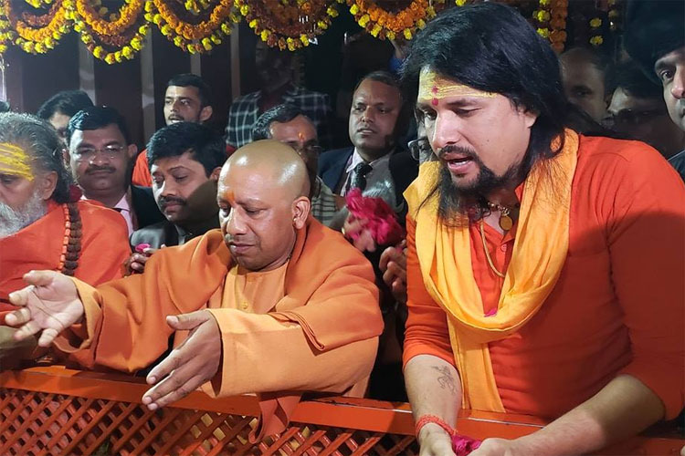 উত্তরপ্রদেশের মুখ্যমন্ত্রী যোগী আদিত্যনাথের পাশে আনন্দ গিরি। ছবি: আনন্দ গিরির ফেসবুক অ্যাকাউন্টের সৌজন্যে।