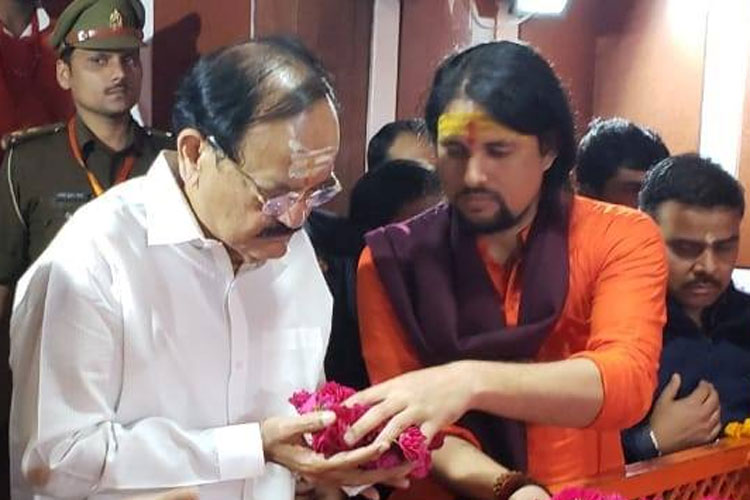 রাজ্যসভার চেয়ারম্যান বেঙ্কাইয়া নায়ডুর সঙ্গে দেখা গিয়েছে আনন্দ গিরিকে। ছবি: আনন্দ গিরির ফেসবুক অ্যাকাউন্টের সৌজন্যে।