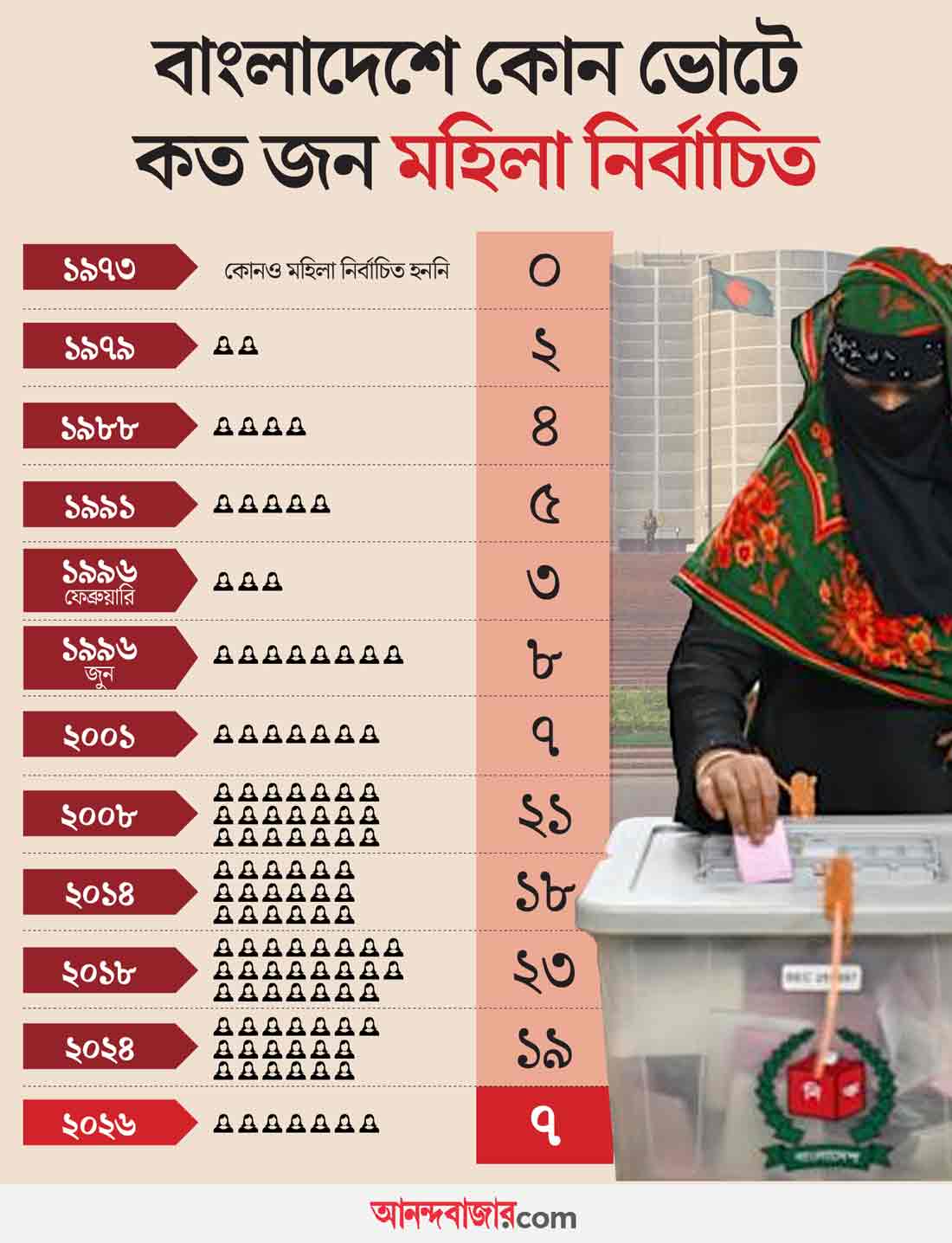 ২০২৪ সালের জুলাই মাসে বাংলাদেশে গণআন্দোলন শুরু হয়। অগস্টে ক্ষমতাচ্যুত হয় শেখ হাসিনার সরকার। প্রতিষ্ঠান-বিরোধী সেই আন্দোলনের পরে মহিলা অধিকার রক্ষাকর্মীদের আশা ছিল, পরের ভোটে রাজনৈতিক দলগুলি মহিলাদের আরও বেশি করে প্রার্থী করবে। তাদের আপত্তি সত্ত্বেও জাতীয় ঐকমত্য কমিশনের সঙ্গে বৈঠকে রাজনৈতিক দলগুলি জানিয়েছিল, মোট আসনের পাঁচ শতাংশে তারা মহিলাদের প্রার্থী করবে। প্রথম আলোর প্রতিবেদন বলছে, কার্যক্ষেত্রে সেই প্রতিশ্রুতি তারা পূরণ করেনি। জামায়াতে ইসলামী (জামাত নামে সমধিক পরিচিত) কোনও মহিলাকেই প্রার্থী করেনি। চলতি ভোটে ২৯৯টি আসনে মোট মহিলা প্রার্থীর সংখ্যা ছিল ৮৬। বাংলাদেশের জাতীয় সংসদে এখন সংরক্ষিত মহিলা আসনের সংখ্যা ৫০। এ বার বাংলাদেশ সংসদে মোট মহিলা সংসদ সদস্যের সংখ্যা হবে ৫৭। অর্থাৎ সংসদে মহিলাদের প্রতিনিধিত্ব থাকছে ১৬ শতাংশ।