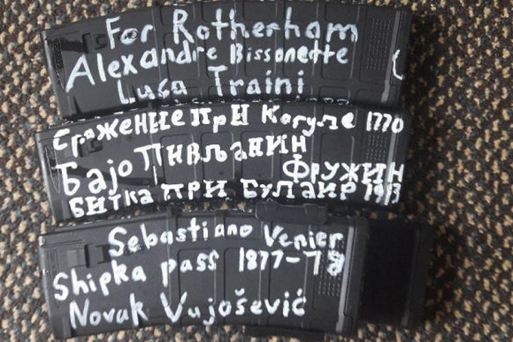 উদ্ধার হওয়া অস্ত্রশস্ত্রে লেখা ছিল আরও বিভিন্ন বন্দুকবাজের নাম। ছবি: রয়টার্স।