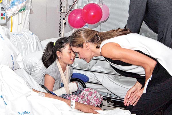 সহানুভূতি: আহতদের সঙ্গে দেখা করতে বার্সেলোনার হাসপাতালে স্পেনের রাজকুমারী লেতিজিয়া। এপি