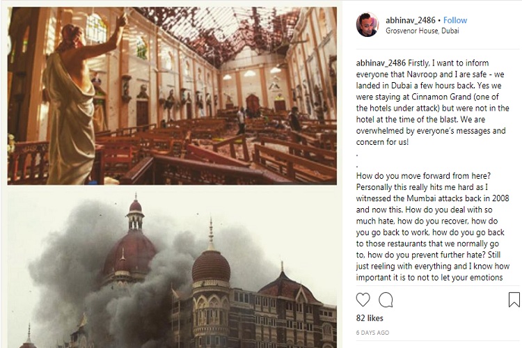 নিজের ইনস্টাগ্রাম অ্যাকাউন্টে ঘটনার বর্ণনা দিতে গিয়ে অভিনব জানান, শ্রীলঙ্কায় সিনেমন হোটেলে ছিলেন তাঁরা। ইস্টারের সকালে স্থানীয় একটি গির্জার প্রার্থনাসভায় যোগ দিয়েছিলেন। কিন্তু প্রার্থনা চলাকালীন মাঝপথেই তাঁদের বেরিয়ে যেতে বলেন যাজক। কলম্বোর বেশ কিছু গির্জায় নাশকতামূলক হামলা হয়েছে, তাই নিরাপত্তার স্বার্থে সকলকে চলে যেতে অনুরোধ করেন তিনি।