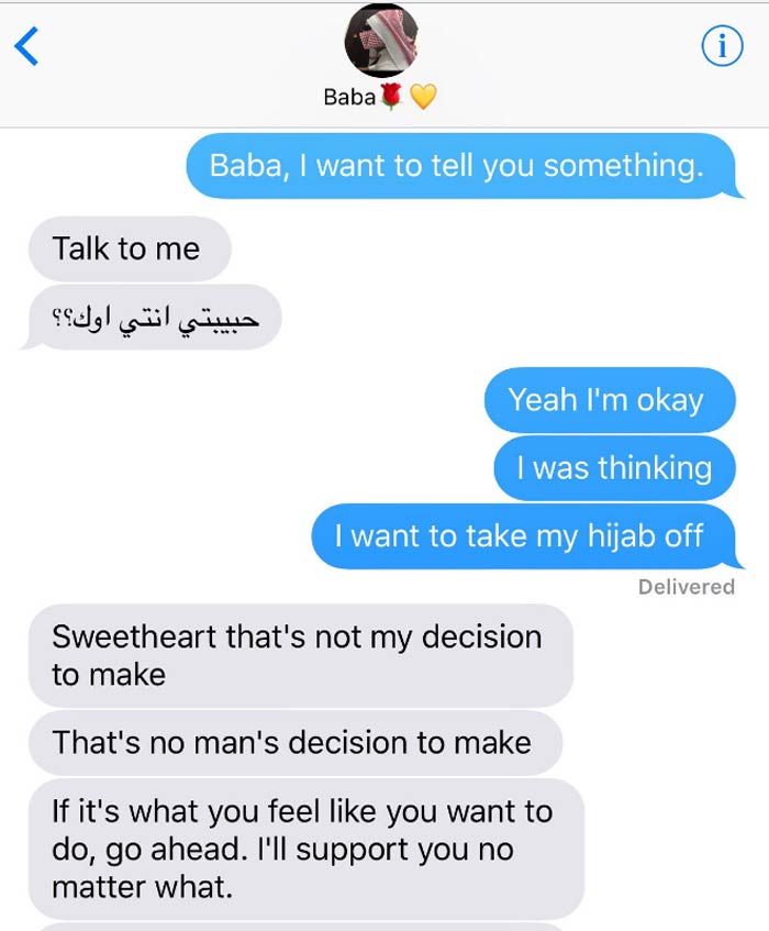 লামেয়া: হ্যাঁ বাবা, আমি ঠিক আছি। আমি ভাবছি...আমি আমার হিজাব খুলে ফেলতে চাই।