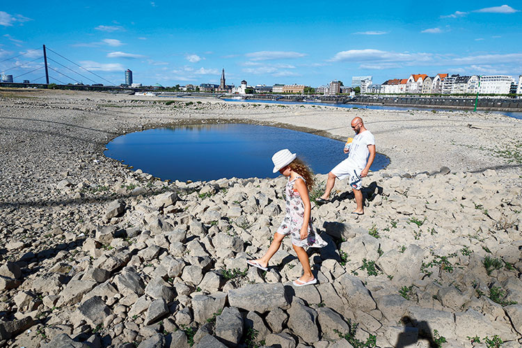 জল নেই রাইন নদীর একাংশে, জার্মানির ডুসেলডর্ফে।
