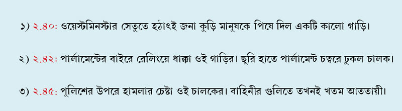 বিগ বেনের কাঁটায় তখন দুপুর দু’টো চল্লিশ। টেমসের দু’পারে পর্যটকদের ভিড়। পুরোদমে চলছে ব্রিটিশ পার্লামেন্টের অধিবেশন। হঠাৎই ওয়েস্টমিনস্টার সেতুর ওপর দিয়ে একটা কালো গাড়ি ছুটে এসে পিষে দিল বেশ কিছু মানুষকে। ধাক্কায় টেমস নদীতেই ছিটকে পড়লেন এক মহিলা। তারপর পার্লামেন্ট ভবনের রেলিংয়ে ধাক্কা মেরে থেমে গেল গাড়িটি। লম্বা ছুরি হাতে গাড়ি থেকে লাফিয়ে নামল চালক। পার্লামেন্ট চত্বরে ঢুকে ঝাঁপিয়ে পড়ল সেখানে মোতায়েন পুলিশের ওপর। পুলিশের পাল্টা গুলিতে তখনই নিহত হয় সে।