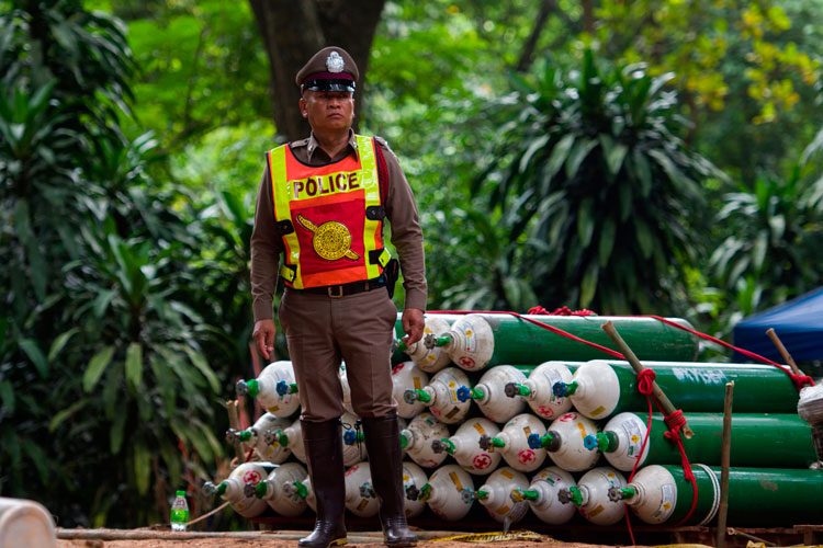 গুহার ভিতরে আরও অক্সিজেন পাঠানোর জন্য প্রস্তুত রাখা হয়েছে সিলিন্ডার। ছবি: এএফপি।