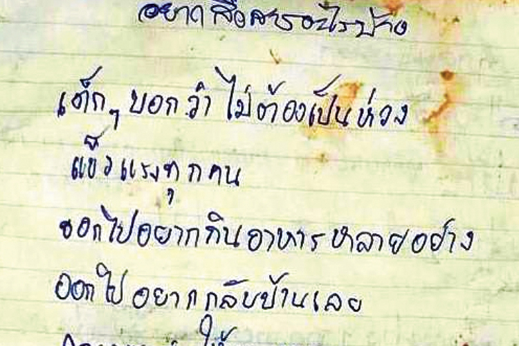 গত কাল ডুবুরিদের হাত দিয়ে খুদেদের বাবা-মায়ের উদ্দেশে একটি চিঠি লিখে পাঠিয়েছেন কোচ। তাঁদের কাছে ক্ষমা চেয়েছেন বাচ্চাদের ঝুঁকির মধ্যে নিয়ে আসার জন্য। লিখেছেন, ‘‘ওদের ক্ষতি হতে দেব না। সবাইকে পাশে থাকার জন্য ধন্যবাদ।’’ জানিয়েছেন, বাড়ি ফিরে কাকিমার রান্না খাওয়ার জন্য মুখিয়ে রয়েছেন তিনি। নৌবাহিনীর সাইটে এক্কাপলের ওই চিঠি প্রকাশ করা হয়েছে।