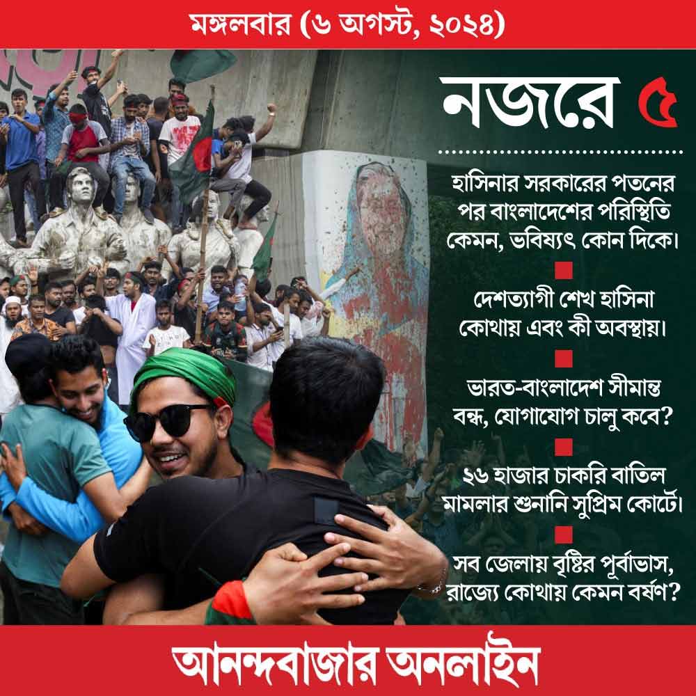 প্রধানমন্ত্রী পদ থেকে হাসিনার ইস্তফার কথা জানিয়ে বাংলাদেশের সেনাপ্রধান জেনারেল ওয়াকার-উজ-জামান সোমবার বলেছিলেন, ‘‘আমরা রাষ্ট্রপতির সঙ্গে দেখা করে আলোচনার মাধ্যমে অন্তর্বর্তী সরকার গঠনের প্রক্রিয়া শুরু করব।’’ এই পরিস্থিতিতে বাংলাদেশ আবার সেনার শাসনে যাবে কি না, তা নিয়ে শুরু হয়েছে জল্পনা। এই খবরে আজ নজর থাকবে।