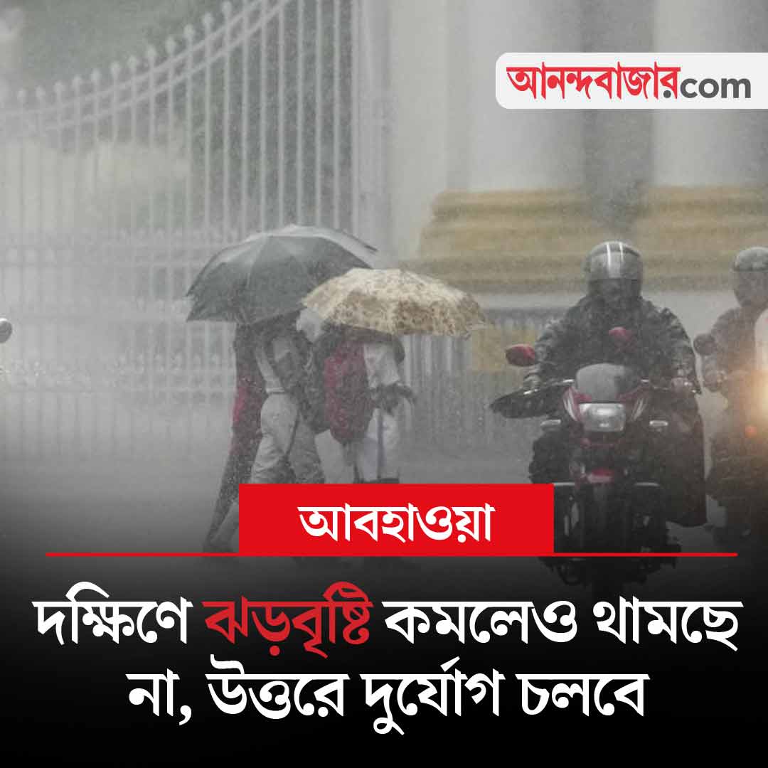 বর্ষার বৃষ্টি আপাতত থামছে না রাজ্যে। কলকাতা-সহ দক্ষিণের সব জেলাতেই বিক্ষিপ্ত ভাবে হালকা থেকে মাঝারি বৃষ্টির পূর্বাভাস রয়েছে। সেই সঙ্গে অস্বস্তি বৃদ্ধি করতে পারে ভ্যাপসা গরম। দক্ষিণবঙ্গের সব জেলায় আজ এবং সোমবার বৃষ্টির পরিমাণ কমবে। জেলাগুলির কিছু অংশে বজ্রবিদ্যুৎ-সহ দু’-এক পশলা বৃষ্টি হতে পারে। উত্তরের পাঁচ জেলা— দার্জিলিং, জলপাইগুড়ি, কালিম্পং, আলিপুরদুয়ার, কোচবিহারে আগামী মঙ্গলবার পর্যন্ত ভারী বৃষ্টির সতর্কতা জারি করা হয়েছে। রবিবার পাঁচ জেলাতেই ভারী (৭ থেকে ১১ সেন্টিমিটার) বৃষ্টির জন্য হলুদ সতর্কতা জারি করা হয়েছে।